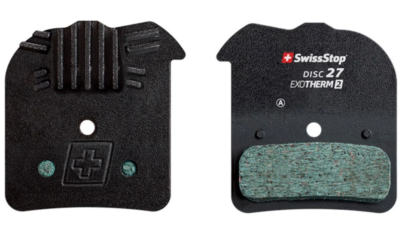 Le SwissStop 27 EXOTherm2 combine un mélange de gomme extrêmement durable et modulable de manière homogène avec une plaque arrière dotée d’ailettes de refroidissement qui permet un freinage stable et puissant dans toutes les conditions.